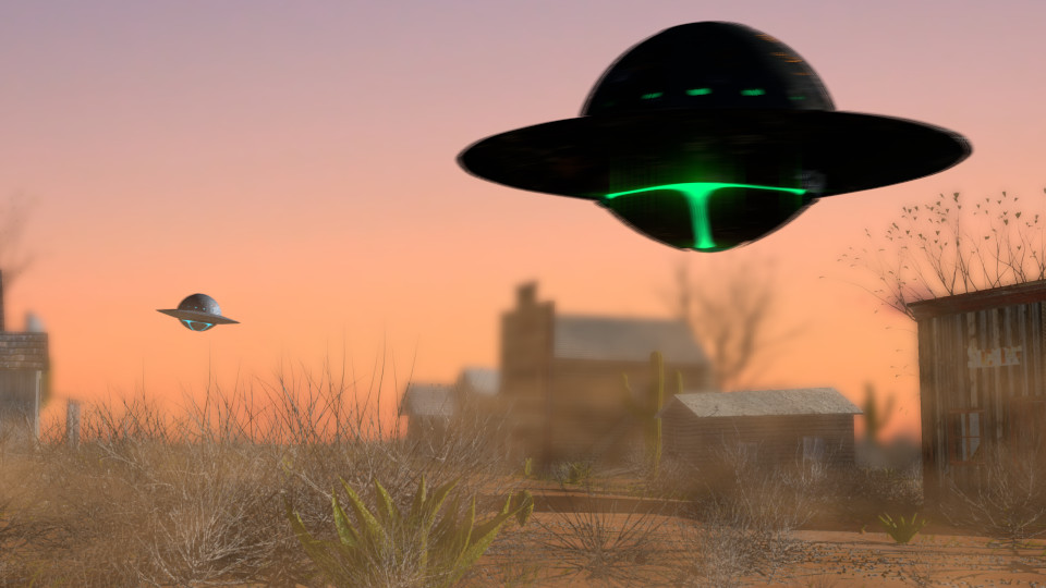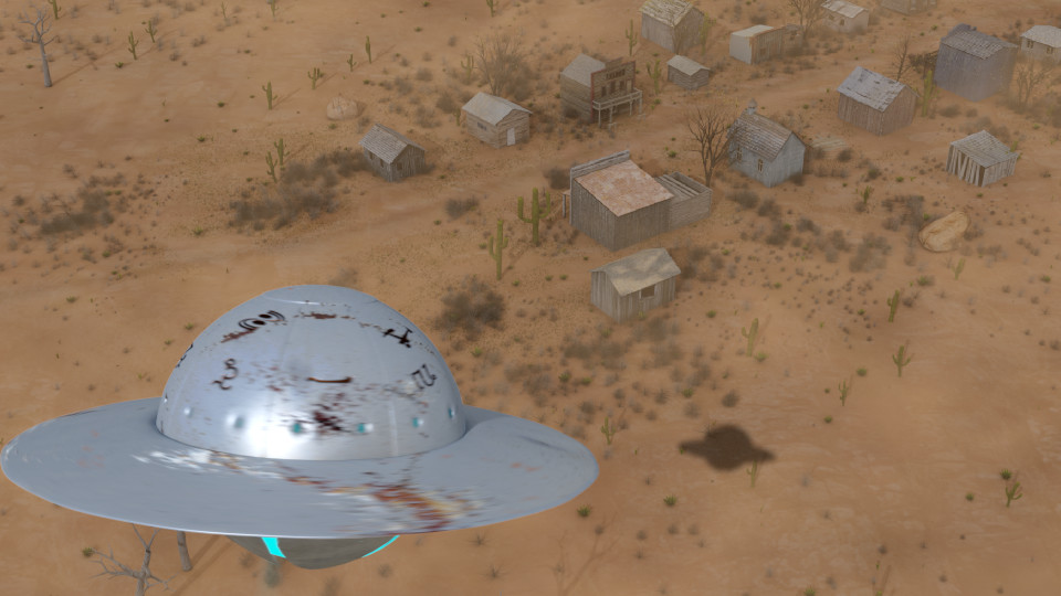 A solitary UFO lands in a ghost town but tension mounts when a more sinister character arrives on the horizon.