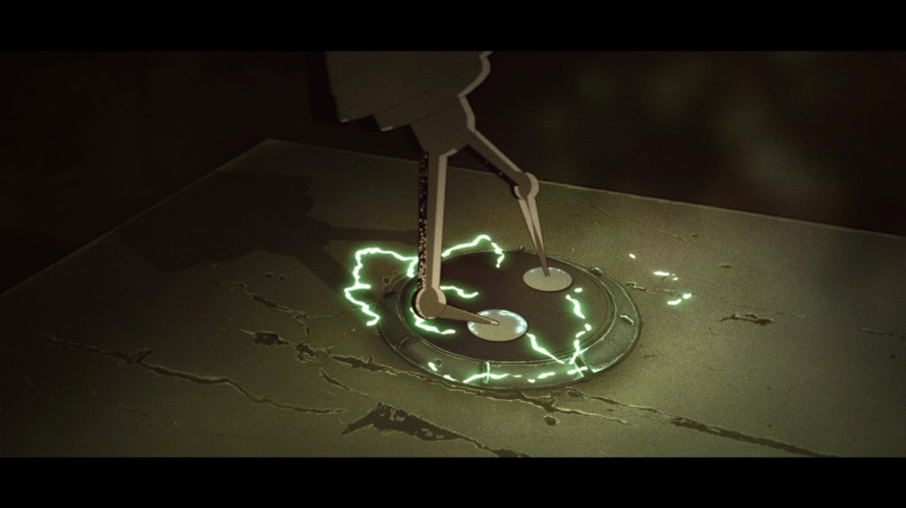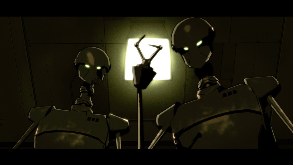 The film starts with a kidnapped human baby boy. We see two of the AI droids implanting iris surveillance chips into the babies eyes.
