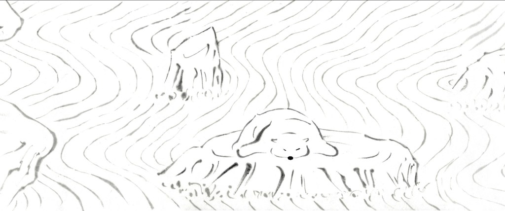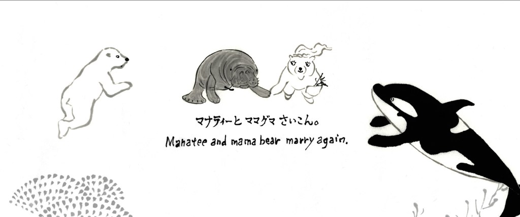 It continues an ancient tradition of “Caricatures of Frolicking animals” in scroll painting-style; this time, “Frolicking Sea Animals,” in animation form, with a play on Japanese and English language word-plays: “Hokyoku-Guma Suggoku Hima. / Polar bear bears boredom”, “Kawauso Kawaisou. / Other otter, poor otter,” etc.