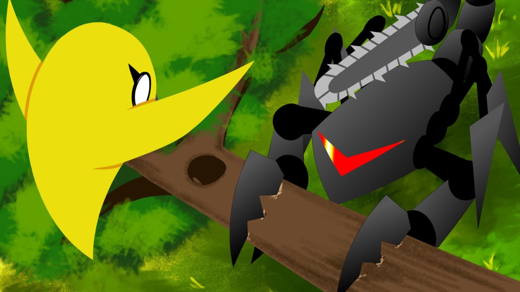 A Songbird who is forced to flee her deforested home accidentally clips her wing on a robotic facility antenna, plummeting into an underground scrap bin. Her collision caused an error within the facility: an obsolete robot is activated.